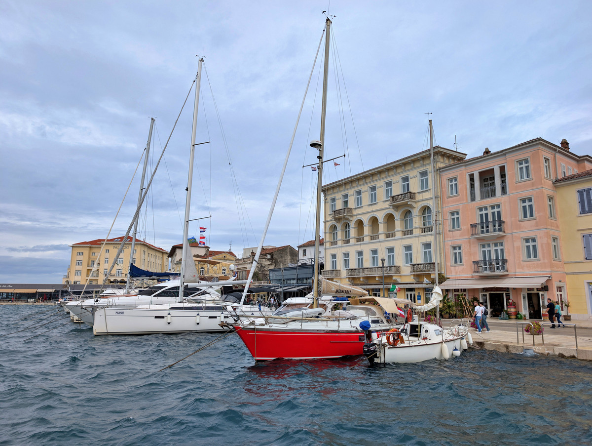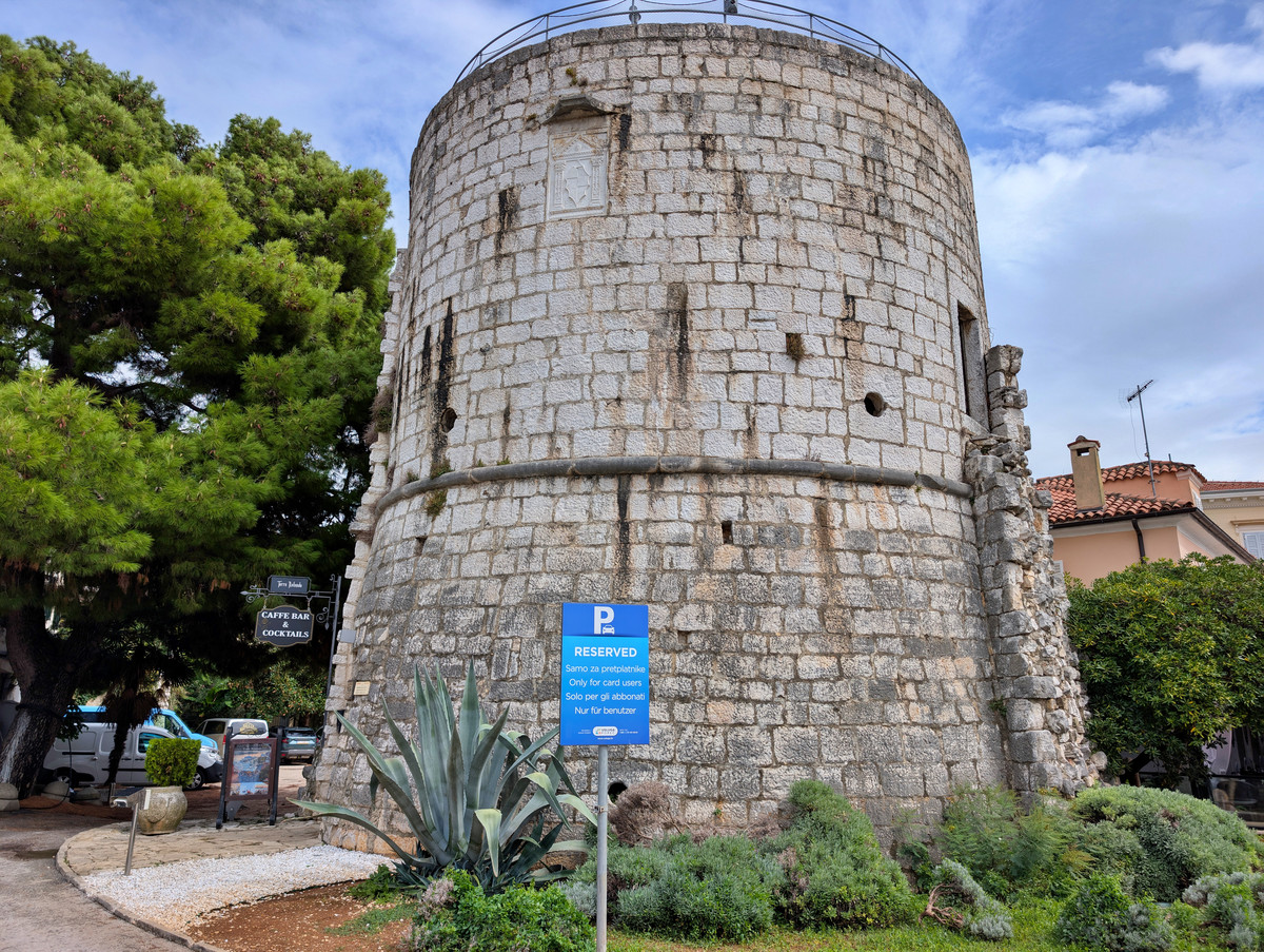 Glücklicherweise besserte sich das Wetter kurz nach unserer Ankunft in Poreč gegen elf Uhr. Da es aufgehört hatte zu regnen, entschieden wir uns spontan für eine Besichtigung der Altstadt. Wir stellten unser Auto auf einem der großen Parkplätze etwas außerhalb des Zentrums ab für 1,50 € pro Stunde. Von dort aus spazierten wir eine knappe Viertelstunde bis zur historischen Altstadt, die wie auch zuvor in Rovinj malerisch auf einer Halbinsel liegt.