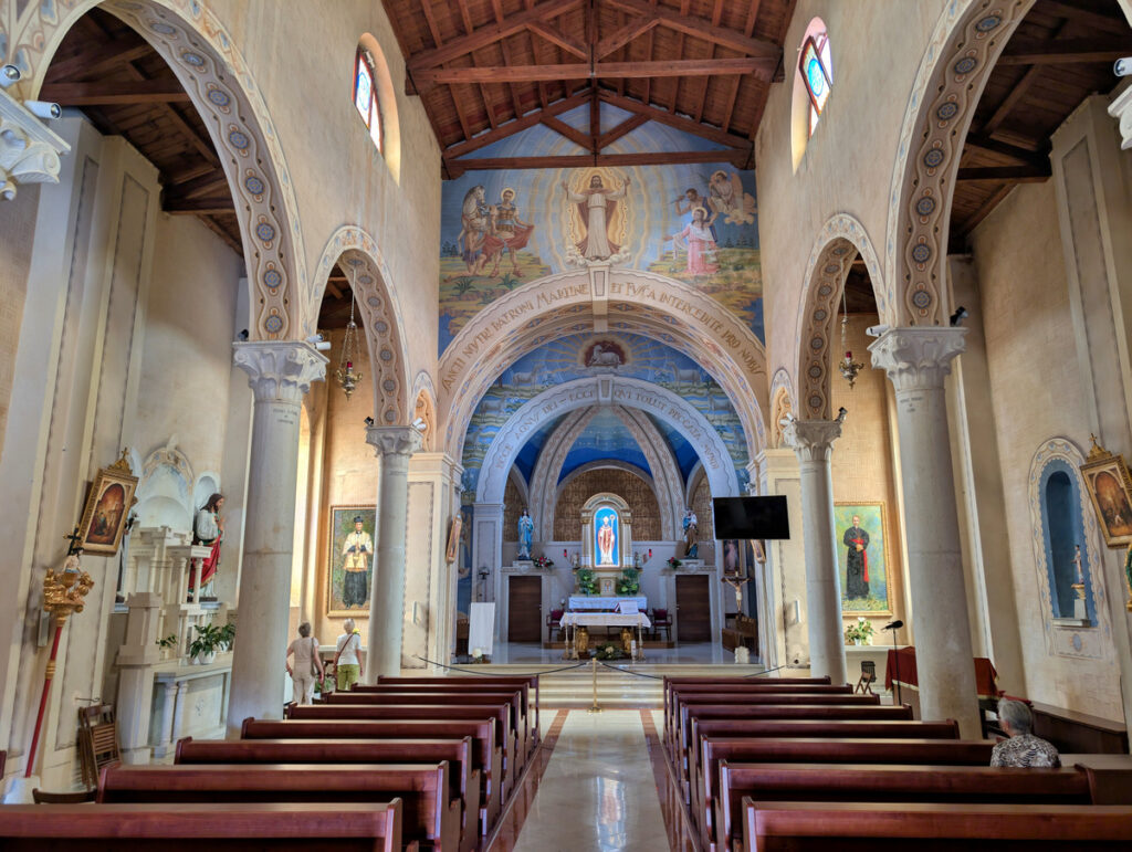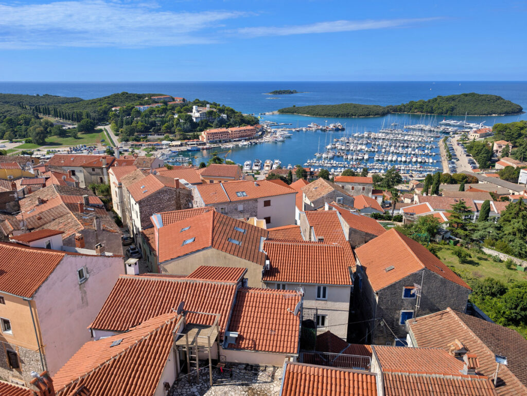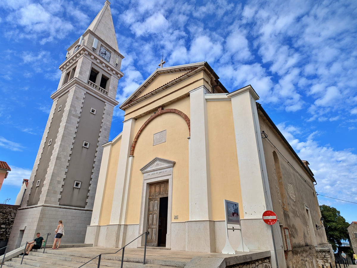 Der darauf folgende Aufstieg auf den Kirchturm wurde belohnt mit einer schönen Aussicht auf Dorf, Meer und Hinterland. Die Kosten betrugen vier Euro pro Person und im Vergleich zum Campanile von Rovinj erleichterten uns hier angenehm breite Stufen den Aufstieg. Auch eine Besichtigung des schönen Kirchenschiffs sollte man sich nicht entgehen lassen.
