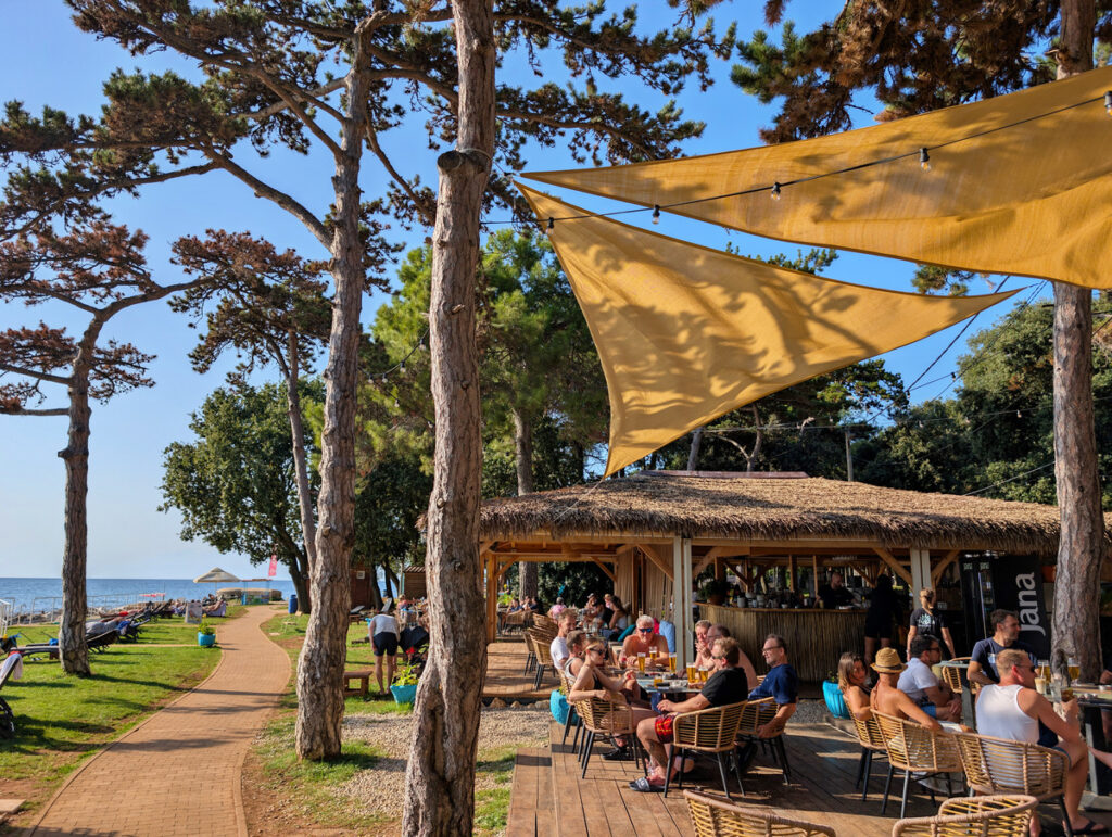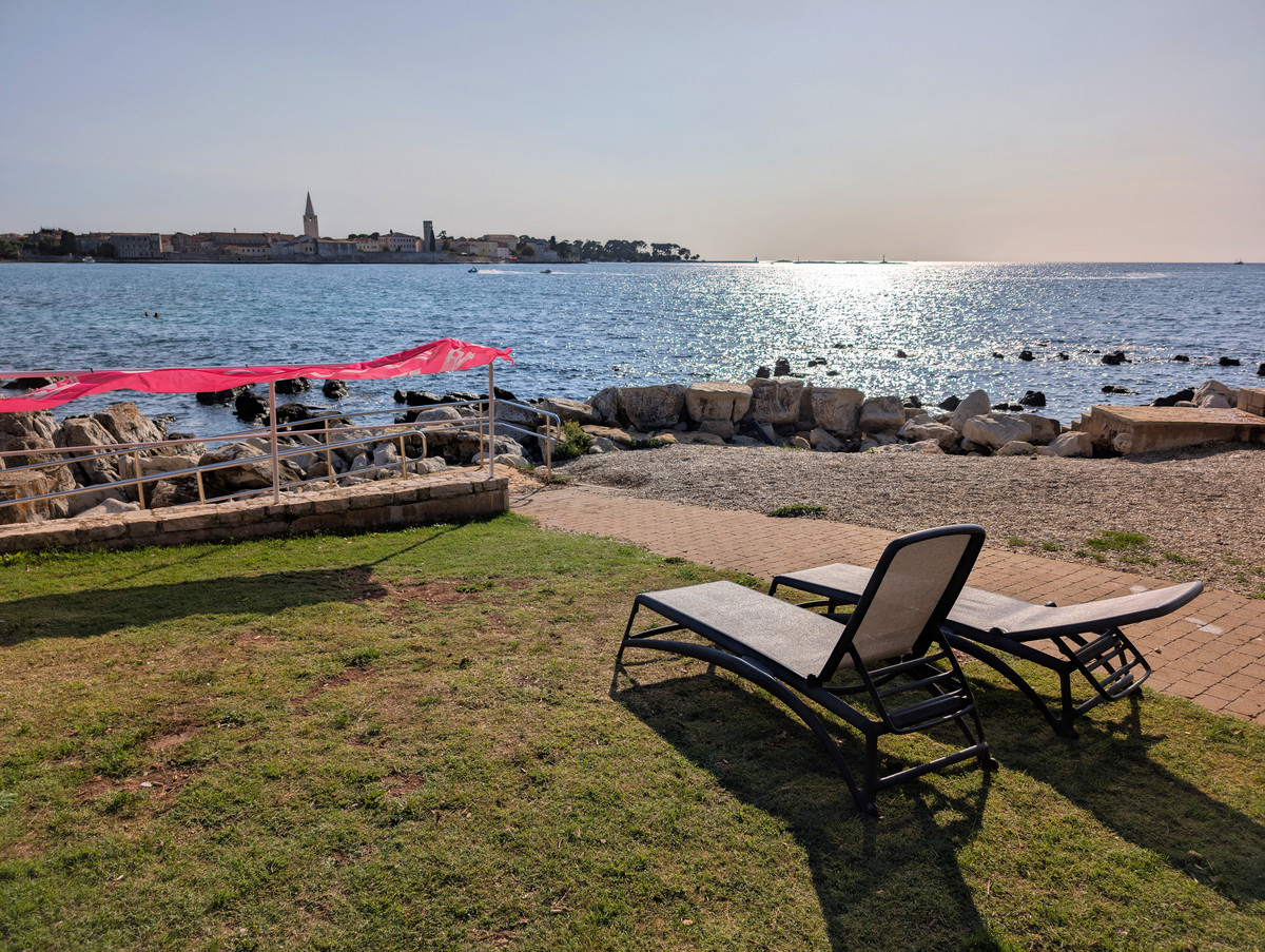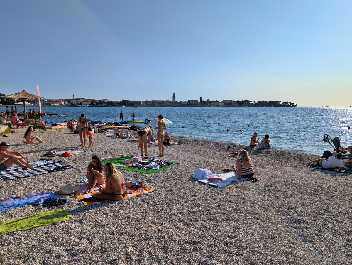 Am späten Nachmittag fuhren wir noch einmal wenige Minuten bis zum kostenlosen Parkplatz Sunset direkt in Strandnähe. Wir spazierten durch einen hübschen Pinienwald mit Beachbar und Fitnessgeräten knappe fünf Minuten zu Fuß, bis wir den Kiesstrand von Parentino erreichten. Dieser stellte sich als sehr gute Wahl heraus: Ein flacher Einstieg, sauberes Wasser sowie ein toller Blick auf die Altstadt von Porec. Zudem gab es hier eine Beachbar, Duschen und Toiletten.
