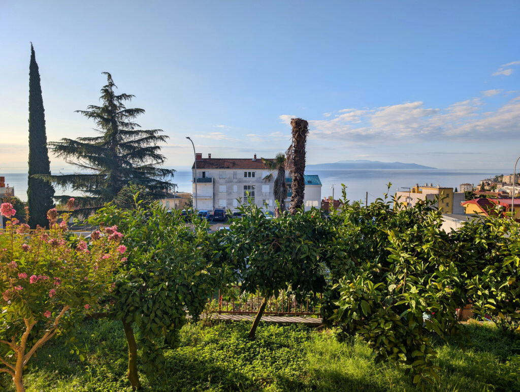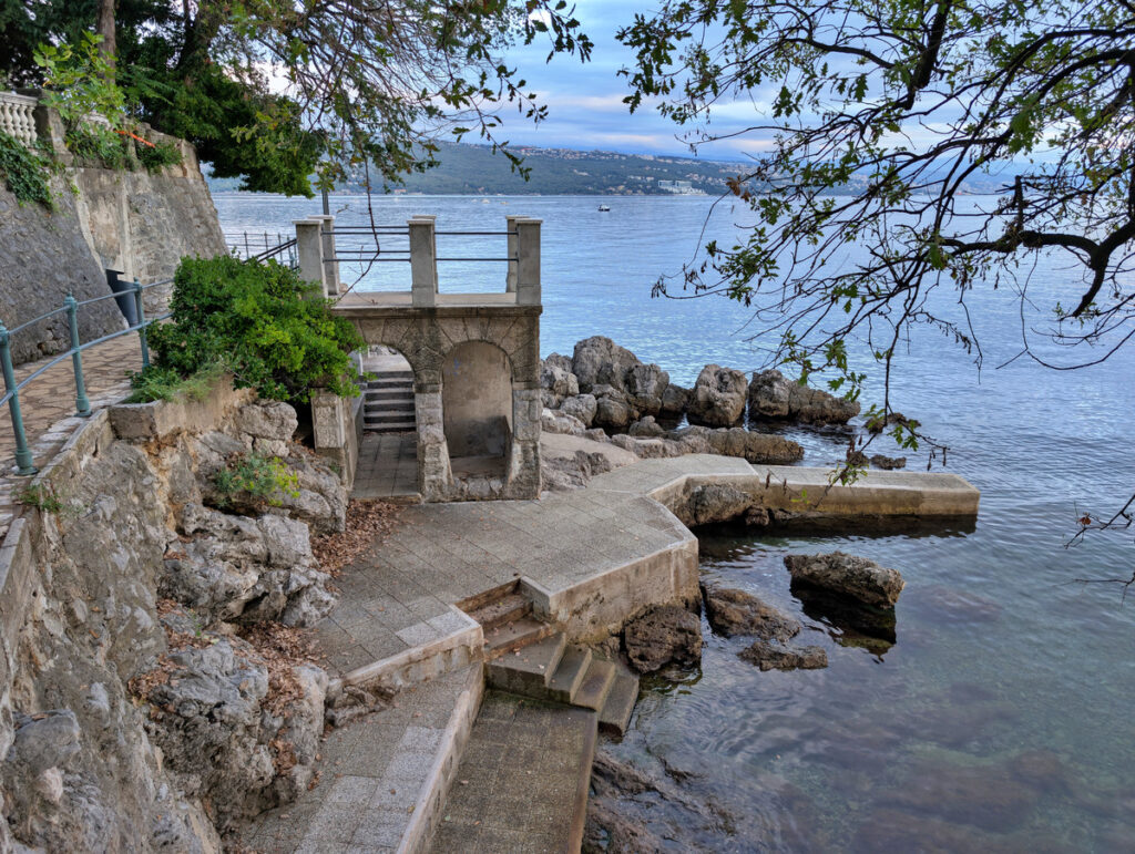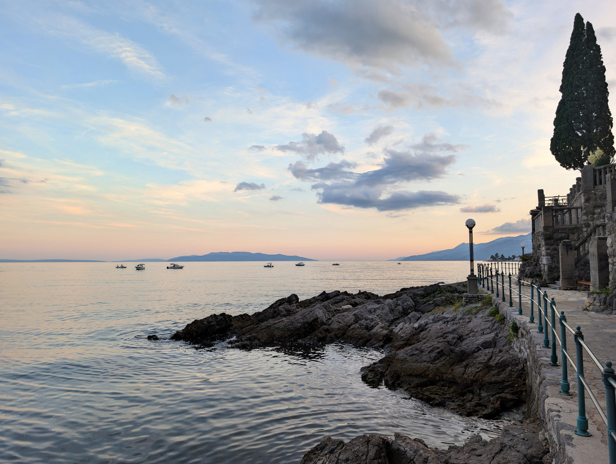 Gegen sieben Uhr abends zogen wir von unserer Unterkunft in Opatija noch einmal zu Fuß los. Wir wollten den berühmten Lungomare heute unbedingt noch einmal bei Sonnenschein erleben. Auch wenn uns das perfekte Licht dann leider erneut verwehrt blieb, war die Abendstimmung am ruhigen Meer dennoch wunderschön.
