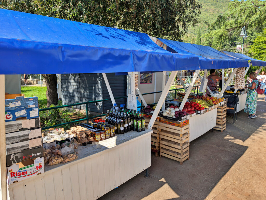 Auf dem Weg zum Wasser passierten wir zahlreiche Stände mit Souvenirs und frischem Obst und allerlei Handgemachtes. Wir deckten uns schließlich jedoch im ebenfalls direkt am Weg gelegenen Konzum Supermarkt mit kalten Getränken und Snacks ein, bevor wir uns ein schönes Plätzchen am Kiesstrand suchten.