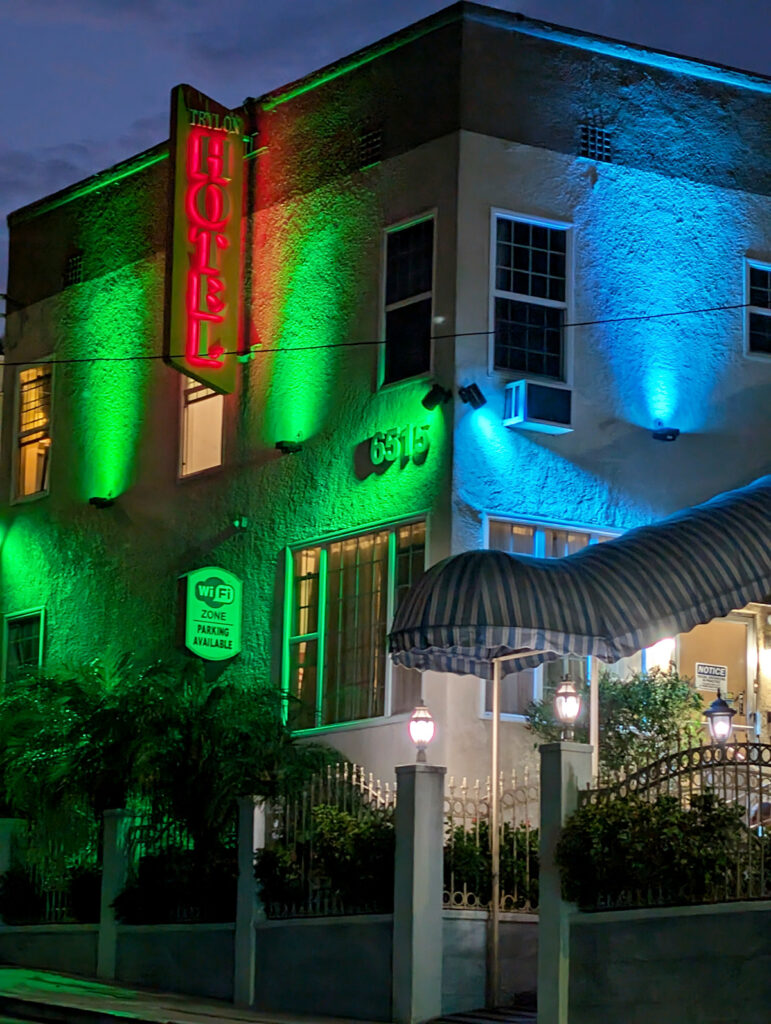 So waren wir gut geschafft und entsprechend froh, am Ende wohlbehalten in East-Hollywood anzukommen. Hier checkten wir ein im kleinen und ruhigen Trylon Hotel, das unsere Unterkunft für die nächsten Tage sein würde. Das Auto parkten wir für 20 Dollar pro Tag auf privaten Parkplätzen an einer nahegelegenen Chevron-Tankstelle, die das Hotel angemietet hatte.