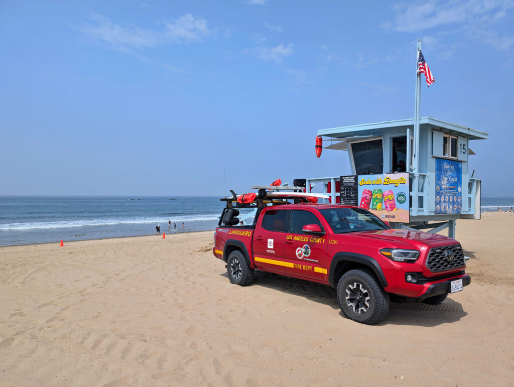Zu allererst wollte ich noch ein Foto von Mitch Buchannon… nee nicht wirklich, aber definitiv von einem der typischen Wachhäuschen samt rotem Pickup und den Rettungsbojen, das man alles aus der 90er-Jahre-Serie Baywatch kannte. Danach hielten wir unsere Füße ins gar nicht so kalte Wasser und entspannten erstmal ein wenig am Strand auf unserer Decke.