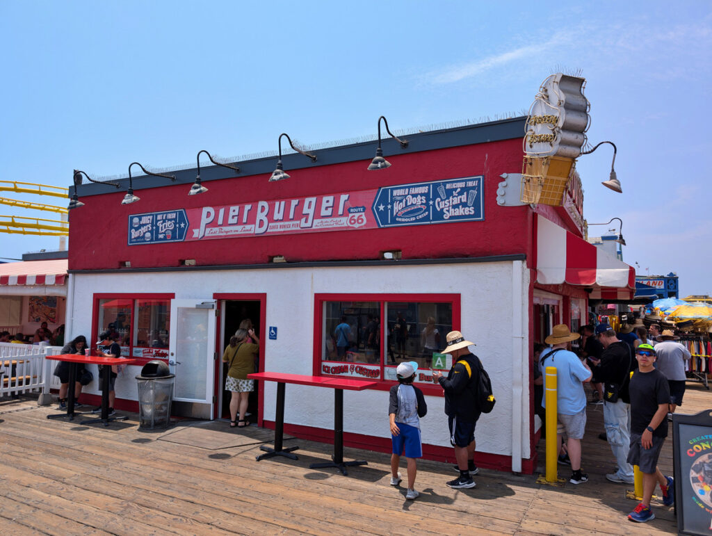 Da wir so langsam hungrig wurden, zog es uns auf den großen hölzernen Santa Monica Pier, denn dort gab es unzählige Möglichkeiten, sich etwas hinter die Kiemen zu schieben. Wir entschieden uns für den Pier Burger und zwei gleichnamige leckere Burger, Cola sowie auch noch ein Vanille-Sunday.