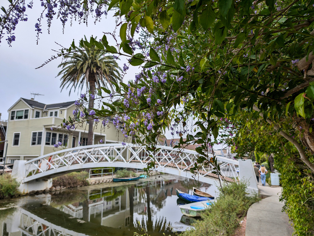 In der Ocean Avenue hatten wir das Glück einen freien Parkplatz zu finden und konnten dort den Wagen kostenlos am Straßenrand abstellen. Zwar sollte man Venice nicht mit dem echten Venedig vergleichen, aber der kurze Spaziergang führte uns durch ein schönes Wohngebiet und entlang der ruhig dahinfließenden Kanäle, die von diversen Brücken überspannt waren.