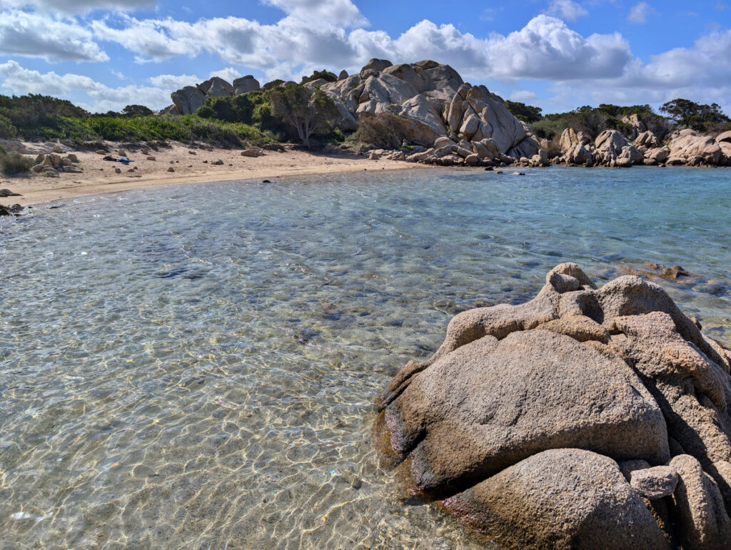Unser erster Stopp war der Strand Testa del Polpo auf der kleinen Nebeninsel Isola Giardinelli, die über eine Brücke erreichbar ist. Wir entschieden uns, bereits in der Nähe der Marina zu parken, da die extrem steinige Schlaglochpiste dorthin selbst unserem Jeep etwas zu viel des Guten schien. Der etwa einen Kilometer lange Fußweg war jedoch sehr reizvoll und führte uns an winzigen Buchten und kleinen Stränden wie der Spiaggia Alberello vorbei.