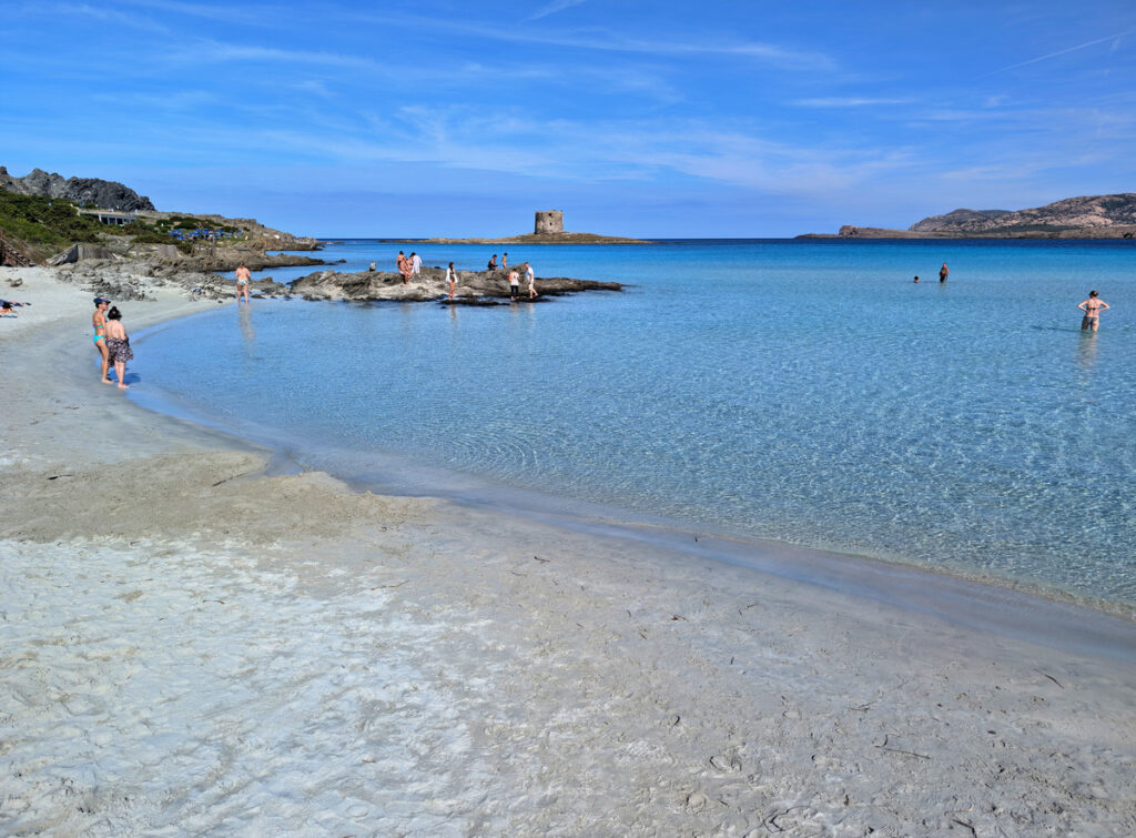 Als wir gegen halb zehn ankamen, waren wir definitiv nicht die Ersten, und trotz Nebensaison füllte es am Strand von La Pelosa sich recht schnell. Dennoch waren wir uns einig: Man sollte diesen Strand einmal gesehen haben. Das Wasser glitzerte in der Sonne hellblau und war so flach, dass wir noch viele Meter weit stehen konnten, während wir auf den alten Sarazenenturm auf der vorgelagerten Insel blickten.