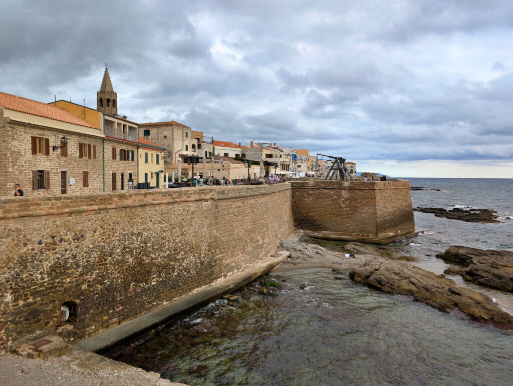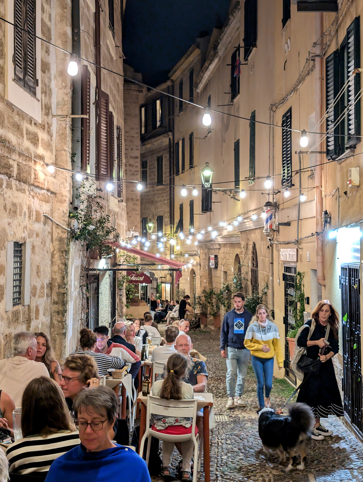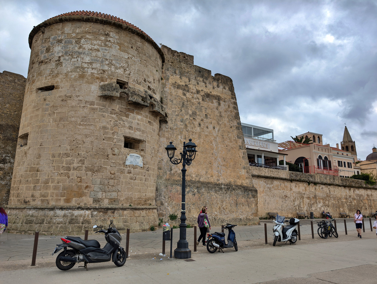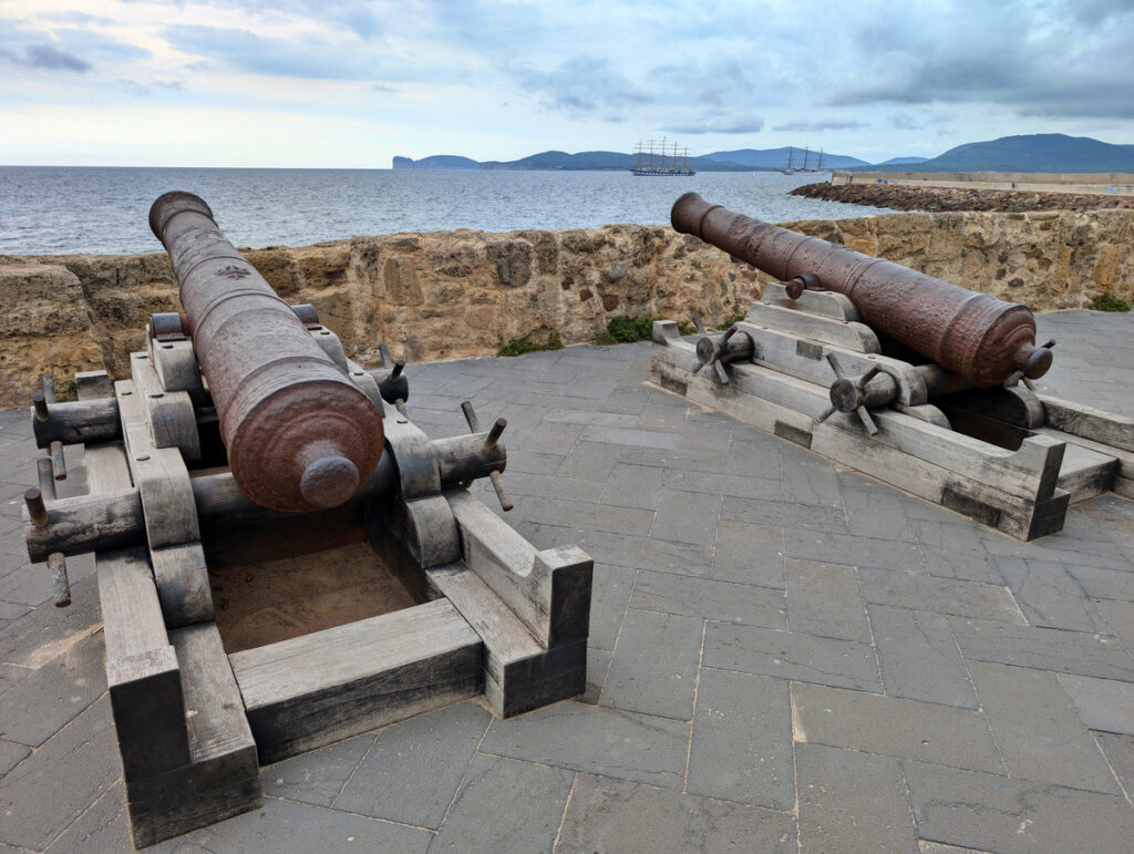 Stattdessen erkundeten wir zu Fuß die pittoreske Altstadt, die uns von Anfang an begeisterte. Wir betraten sie über die massive Stadtmauer am Torre della Polveriera. In dem Moment, als ein prächtiger Fünfmaster im Hafen ablegte, kam passenderweise die Sonne heraus und tauchte die Kanonen, Katapulte und die vielen Bars auf der Mauer in ein goldenes Licht. Diese Atmosphäre weckte in uns zudem Erinnerungen an Saint-Malo in der Bretagne.