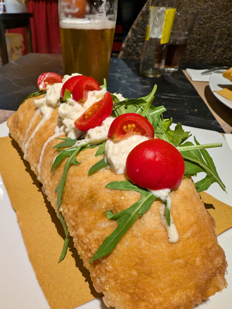 Die Hauptspeise überraschte uns jedoch: Die Pizza war nicht im Steinofen gebacken, sondern frittiert und gefüllt wie eine Calzone. Das war zwar eine interessante Erfahrung und geschmacklich gut, aber auch extrem mächtig. Wir beschlossen daher, beim nächsten Mal wieder lieber zur klassischen Variante zu greifen.