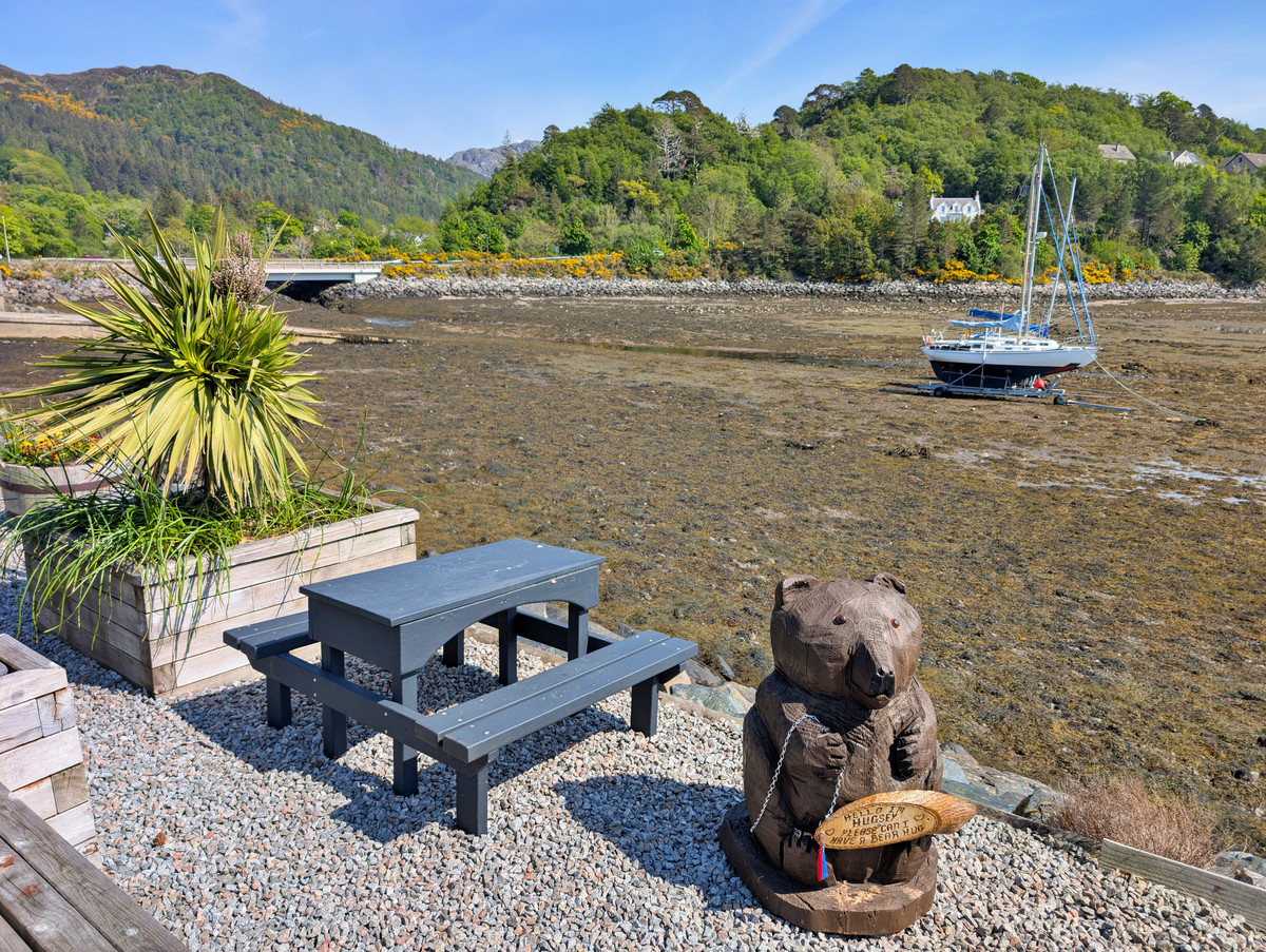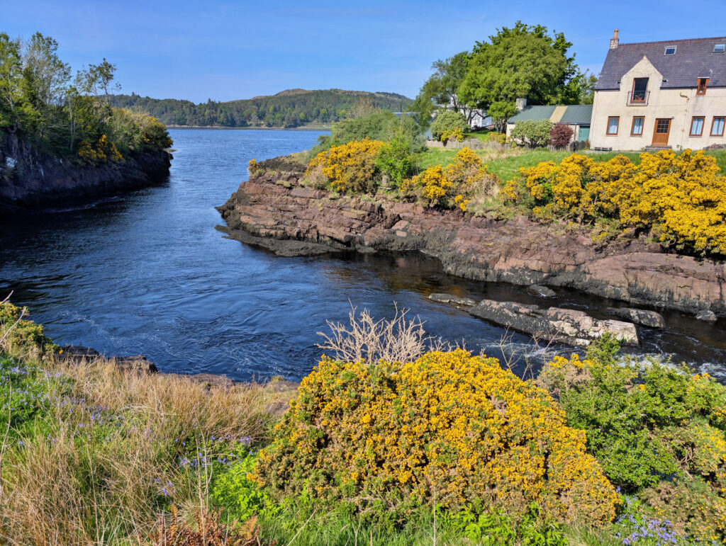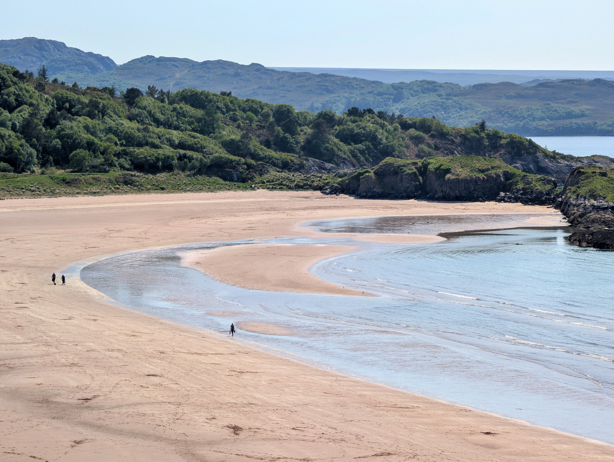 Einen längeren Halt legten wir im kleinen Fischerdorf Charlestown ein. Wir deckten uns in einem kleinen Lädchen mit Getränken und Sandwiches ein und setzten uns damit auf die liebevoll dekorierte Promenade. Kurz hinter dem Ort entdeckten wir auf der linken Seite einen weiteren Parkplatz bei Gairloch Beach, von dem aus wir einen fantastischen Blick auf den Traumstrand aus feinstem Sand hatten.