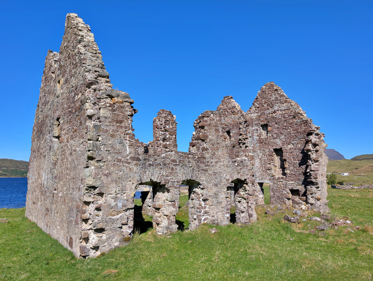 Kurze Zeit später erreichten wir das Calda House. Die Ruine dieses ehemaligen Herrenhauses erzählte uns eine charmante Geschichte: Der einstige Burgherr baute es eigens für seine Gemahlin, die schlichtweg keine Lust hatte, in der alten und sicherlich etwas zugigen Burg von Ardvreck Castle zu wohnen. 🙂