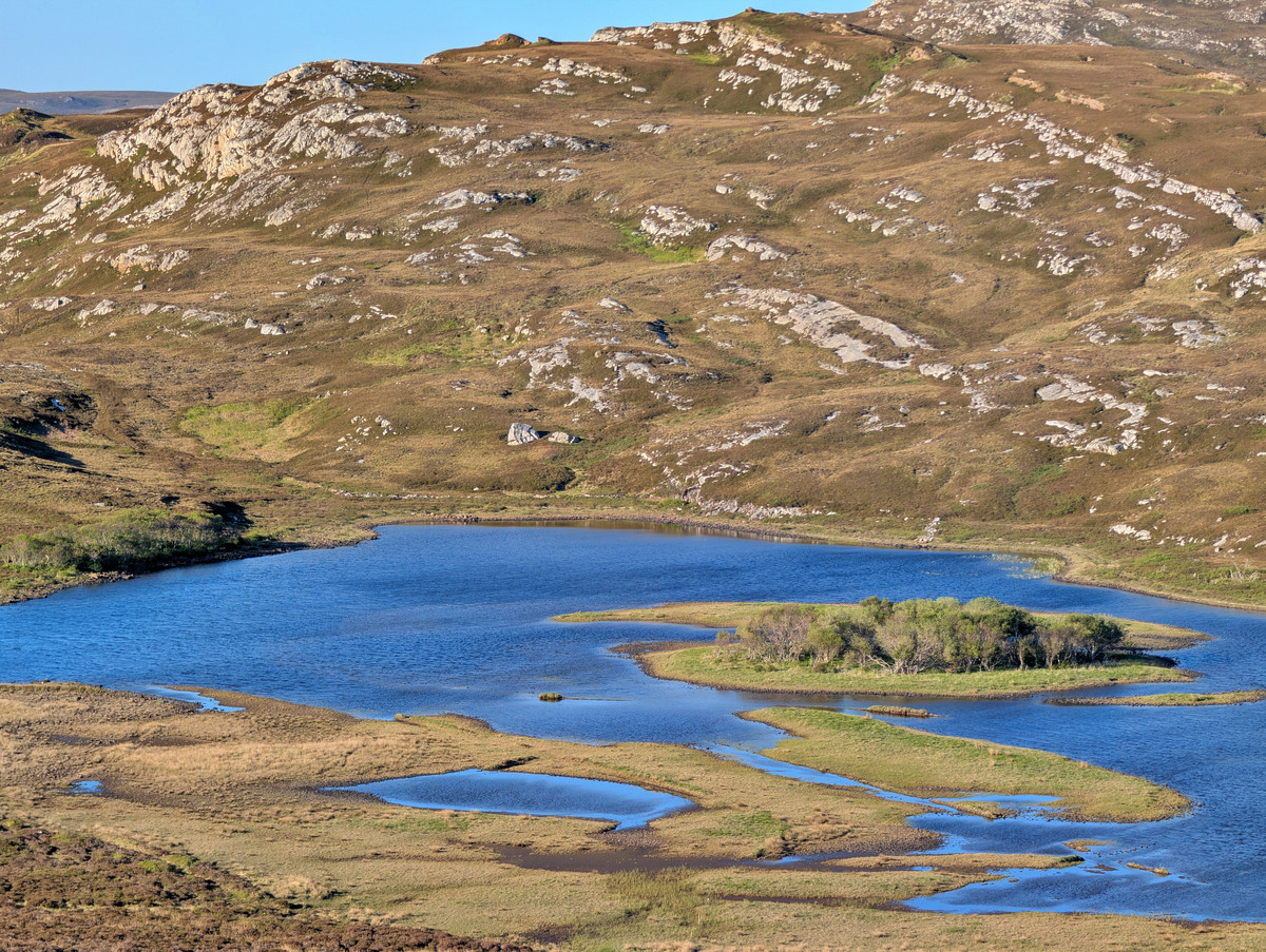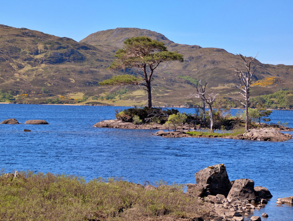 Dem Ufer des Loch Assynt auf der North Coast 500 folgend fuhren wir weiter gen Norden. Wir kamen jedoch nicht allzu weit, denn an einem kleinen Parkplatz mit Hinweistafel legten wir direkt weiteren kurzen Fotostopp ein. Denn von dort und vom Ufer des Sees, wenn man sich nicht scheute die Füße im Torf etwas nasszumachen, bot sich ein toller Blick auf die etwas mystisch anmutenden Inselchen mit ihren teils abgestorbenen Bäumen.