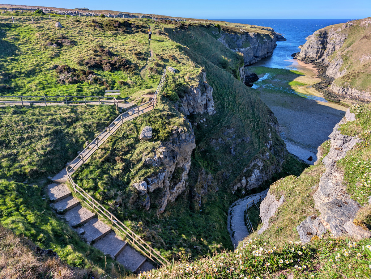 Nur ein kurzes Stück weiter erreichten wir die Smoo Cave. Direkt am Eingang gab es einen kleinen kostenlosen Parkplatz, alternativ steht ein größerer Parkplatz oberhalb der Straße für zwei Pfund (2,40 €) pro Stunde zur Verfügung. Die Höhle war beeindruckend, auch wenn der Wasserfall im Inneren aufgrund des trockenen Wetters leider pausierte. Wer mehr erfahren möchte, kann dort geführte Touren für 15 Pfund (18,00 €) pro Person buchen.