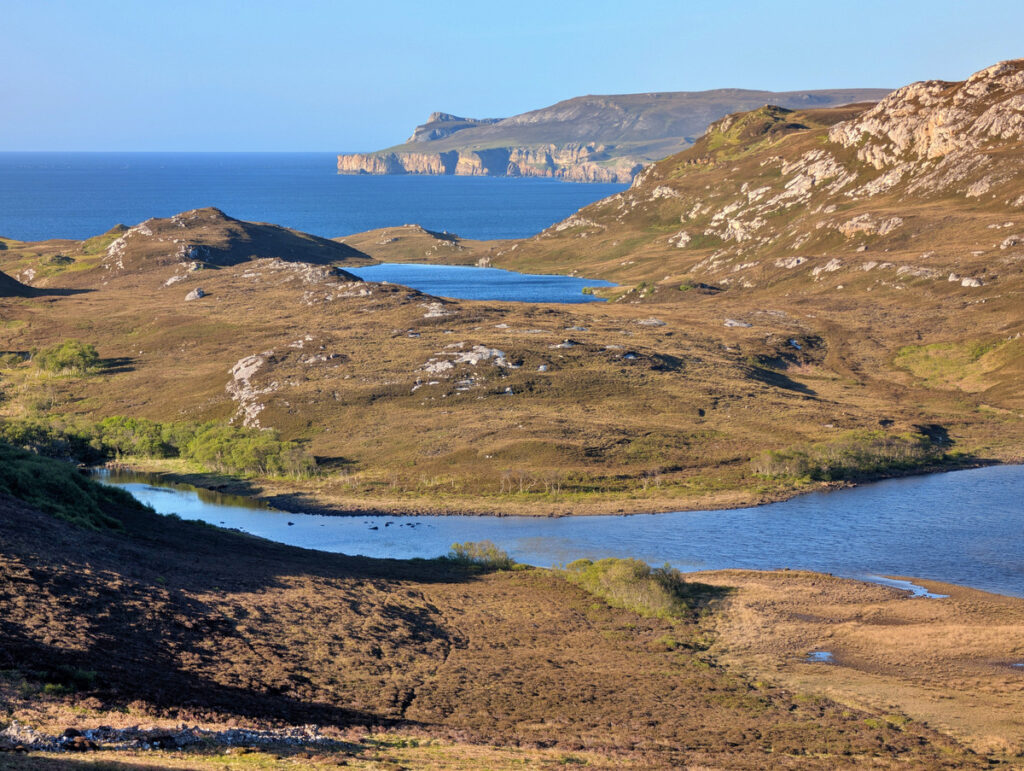 Nach dem Frühstück und dem Tanken in Ullapool setzte sich unser Abenteuer auf der North Coast 500 fort. Das Ziel des Tages war unsere Unterkunft in Tongue, ganz im Norden der Insel. Das Wetter meinte es weiterhin gut mit uns: Bei strahlendem Sonnenschein und fast 20 Grad Celsius genossen wir jede Meile.