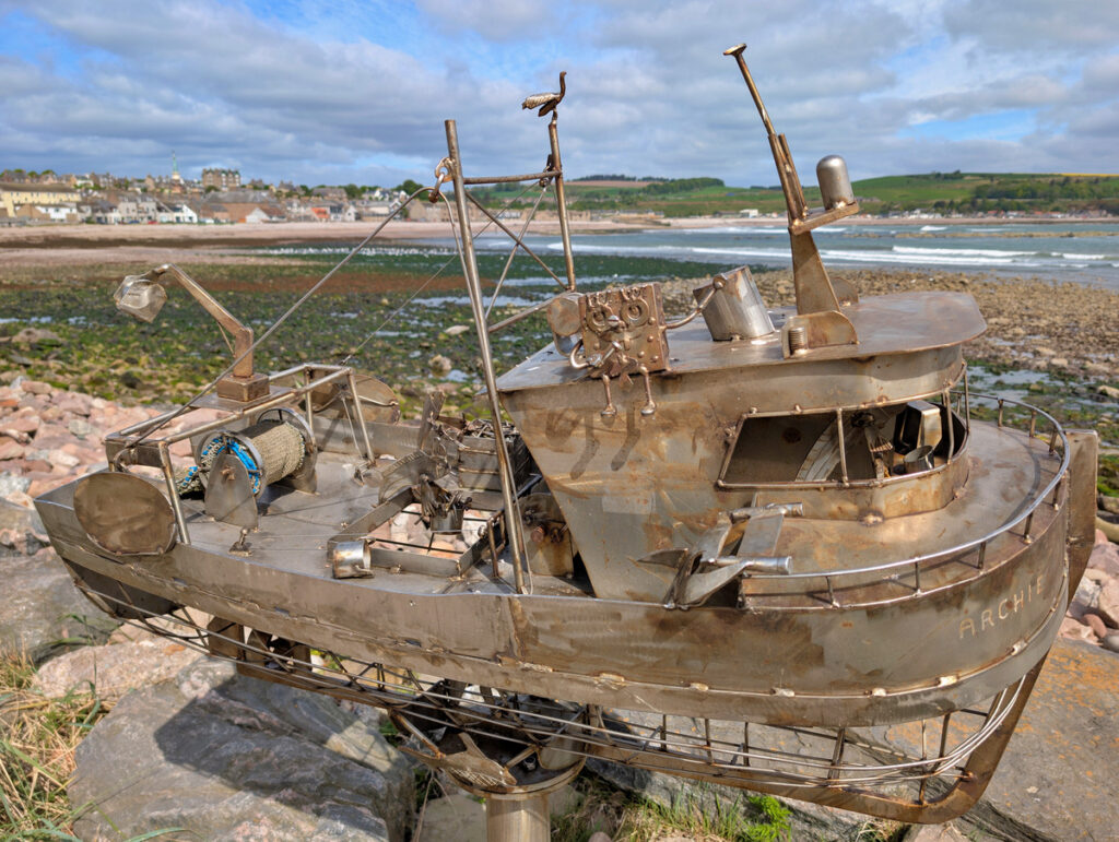 Zuerst steuerten wir den Hafen von Stonehaven an, wo wir einen kostenlosen Parkplatz fanden. Wir spazierten an der Promenade entlang, bewunderten die witzigen Metallskulpturen und beobachteten die hübschen Holzboote im Hafen. Der feine Sandstrand wirkte im grauen Licht fast ein wenig melancholisch.