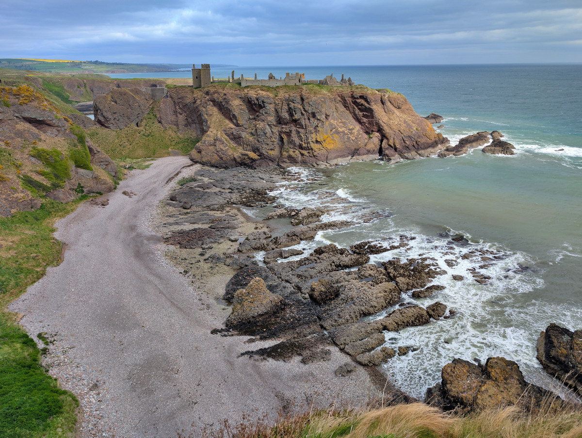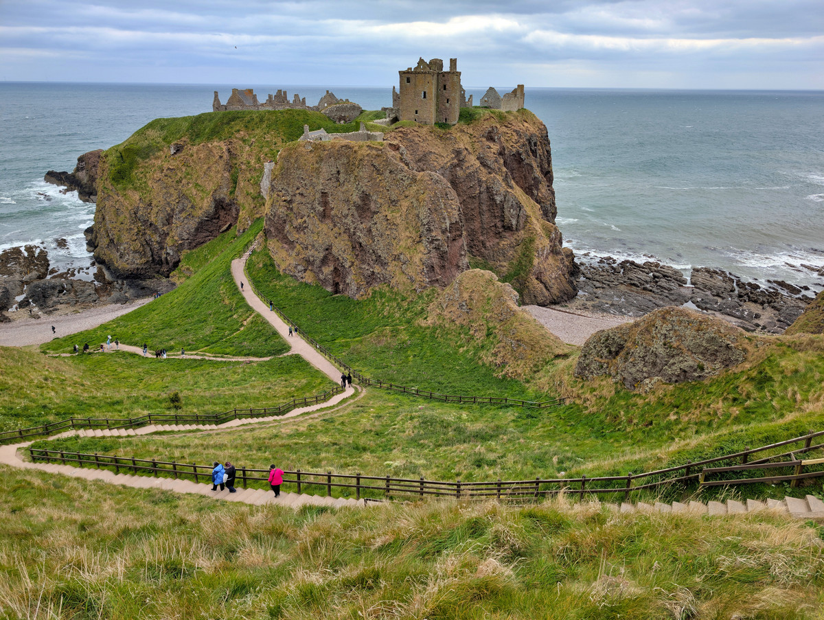 Danach fuhren wir zum Dunnottar Castle. Auch hier konnten wir kostenlos parken und uns an einem Kiosk mit Kaffee versorgen. Die Ruine thront wildromantisch und einsam auf einem vorgelagerten Felsen – ein wahrlich imposanter Anblick! Während wir dort waren, kam sogar ein wenig die Sonne heraus und setzte das Gemäuer perfekt in Szene.
