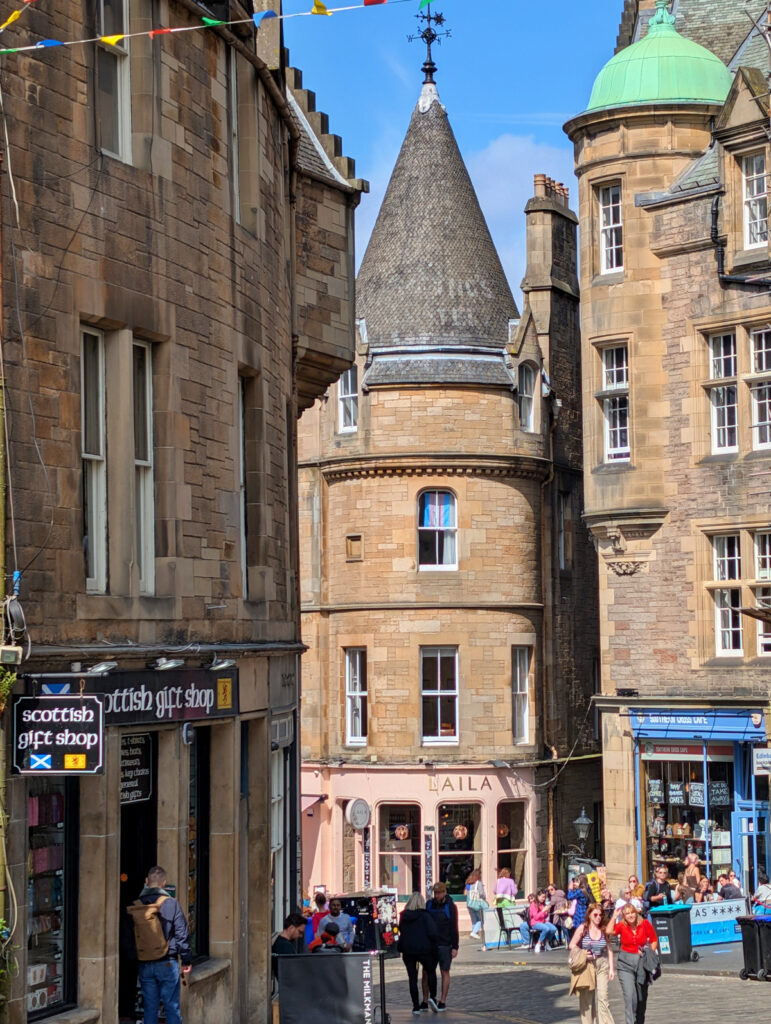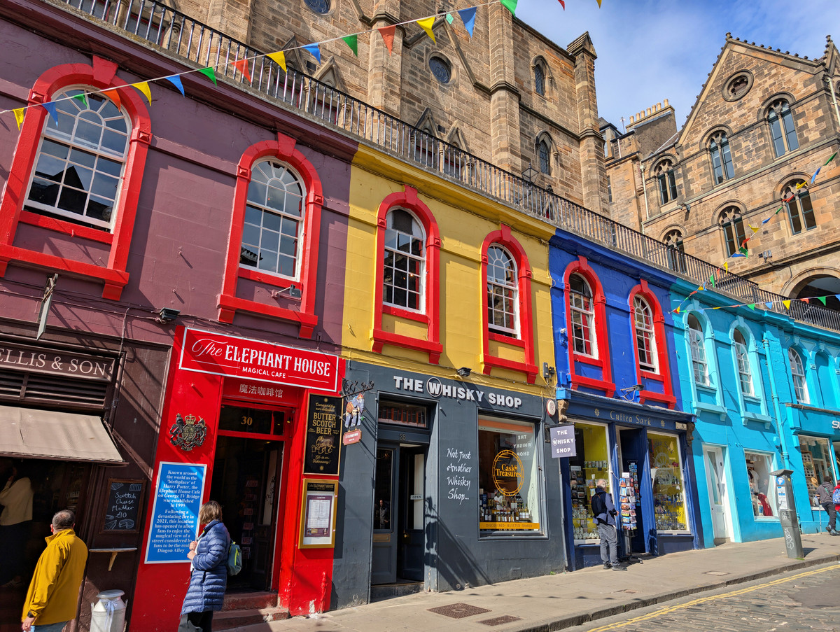 Bereits quasi um die Ecke erreichten wir ein weiteres Highlight Edinburghs, die Victoria Street. Mit ihren bunten Hausfassaden und den vielen „magischen“ Läden erkannten wir sofort das Vorbild für die Winkelgasse aus Harry Potter. Natürlich regiert hier der Kommerz und man kann vom Zauberstab über Schals der Häuser von Hogwarts bis hin zum Butterbier alles bekommen, was das Harry-Potter-Herz höher schlagen lässt.