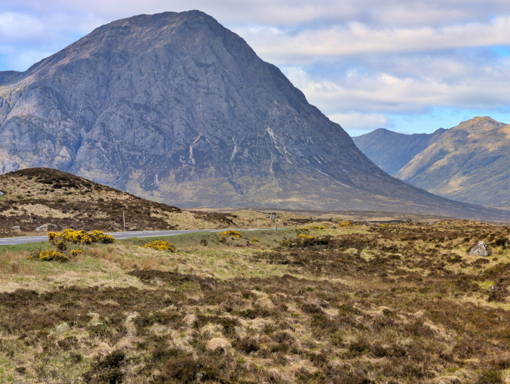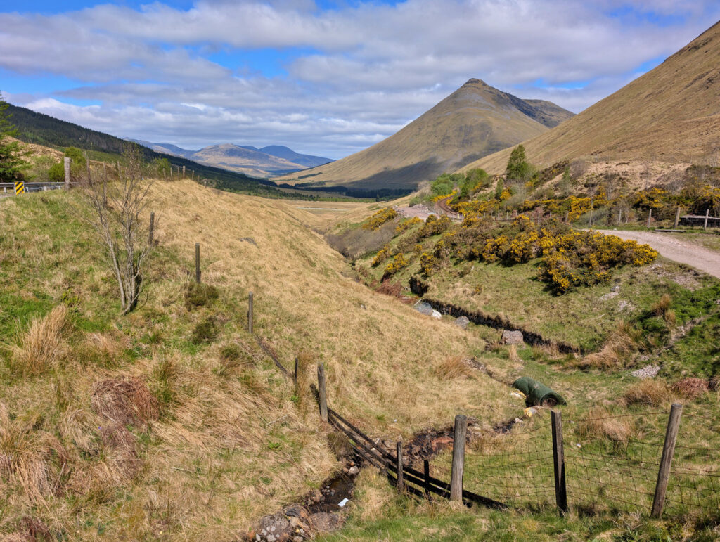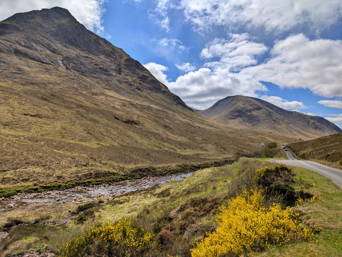 Die Fahrt führte uns bis ans Ende der Stichstraße am Loch Etive. Wir genossen die entspannte Atmosphäre und die beeindruckende Natur, die dort so imposant wie ein Fjord wirkte. Es überraschte uns kaum, dass im Glen Etive Szenen für James Bond: Skyfall und Harry Potter gedreht wurden. Wir unternahmen eine kurze Wanderung zurück zu einer Steinbrücke bei einer hübschen weißen Cottage und folgten einem schmalen Pfad am anderen Ufer des Baches. Nach der Überquerung einer trockenen Furt wurden wir mit einem fantastischen Blick auf die leuchtend gelben Ginsterbüsche belohnt.