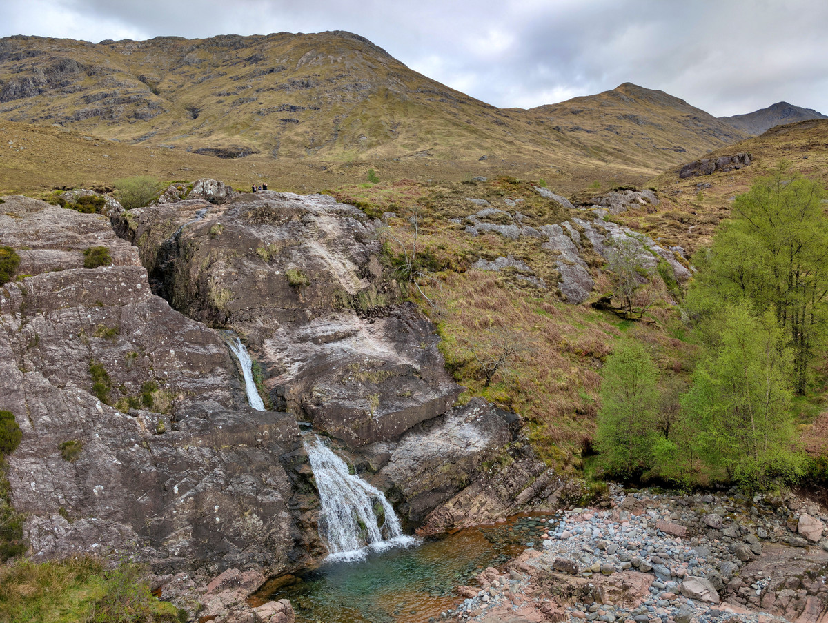 Nach einigen Fahrminuten entdeckten wir einen tollen Fotospot direkt am Flussbett mit dem Doppel-Wasserfall des gleichnamigen Glen Etive Waterfall.